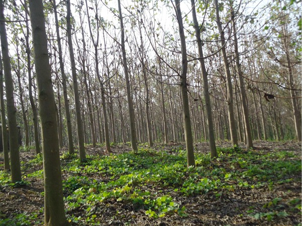 定植后生長不好的幼樹,可在早春2月平茬。封土成丘,待萌發10~15cm高時,留1壯芽,其余抹去。并配合松土施肥,可以重新長成健壯幼樹。平茬的泡桐,樹干通直,基部沒有明顯的彎曲,提高了泡桐的經濟利用價值。