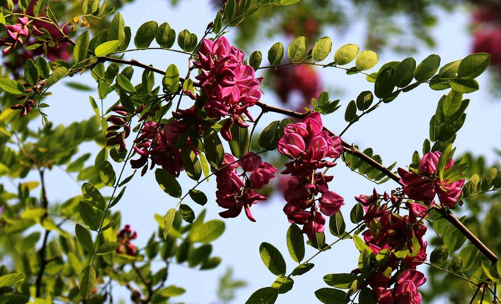 3、紅花刺槐與香花槐的花均為紫紅色,不易分辨,前者一年只開一次花,而后者在我國北方便可1年開花兩次,南方可3次或連續(xù)開花,只是不結莢果;