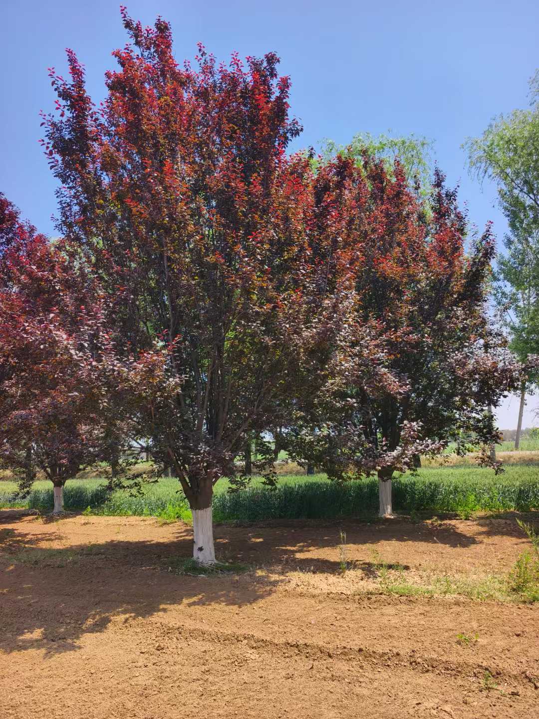 河北百盛苗木基地,大量批發10-15公分假植紅葉李,價格便宜,樹型好,移栽成活率高。